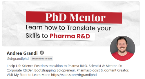 Dr. Andrea Grandi 6 years ago was a Postdoc in Pharmacology. In 2019, he escaped the Postdoc “black hole” and landed his first role in Biotech. Since 2020, he’s been working as a Corporate R&D Scientist in Pharma. Now, he helps Postdocs translate their academic skills into Pharma R&D careers. He would like to connect with like-minded, inspiring people on Substack!